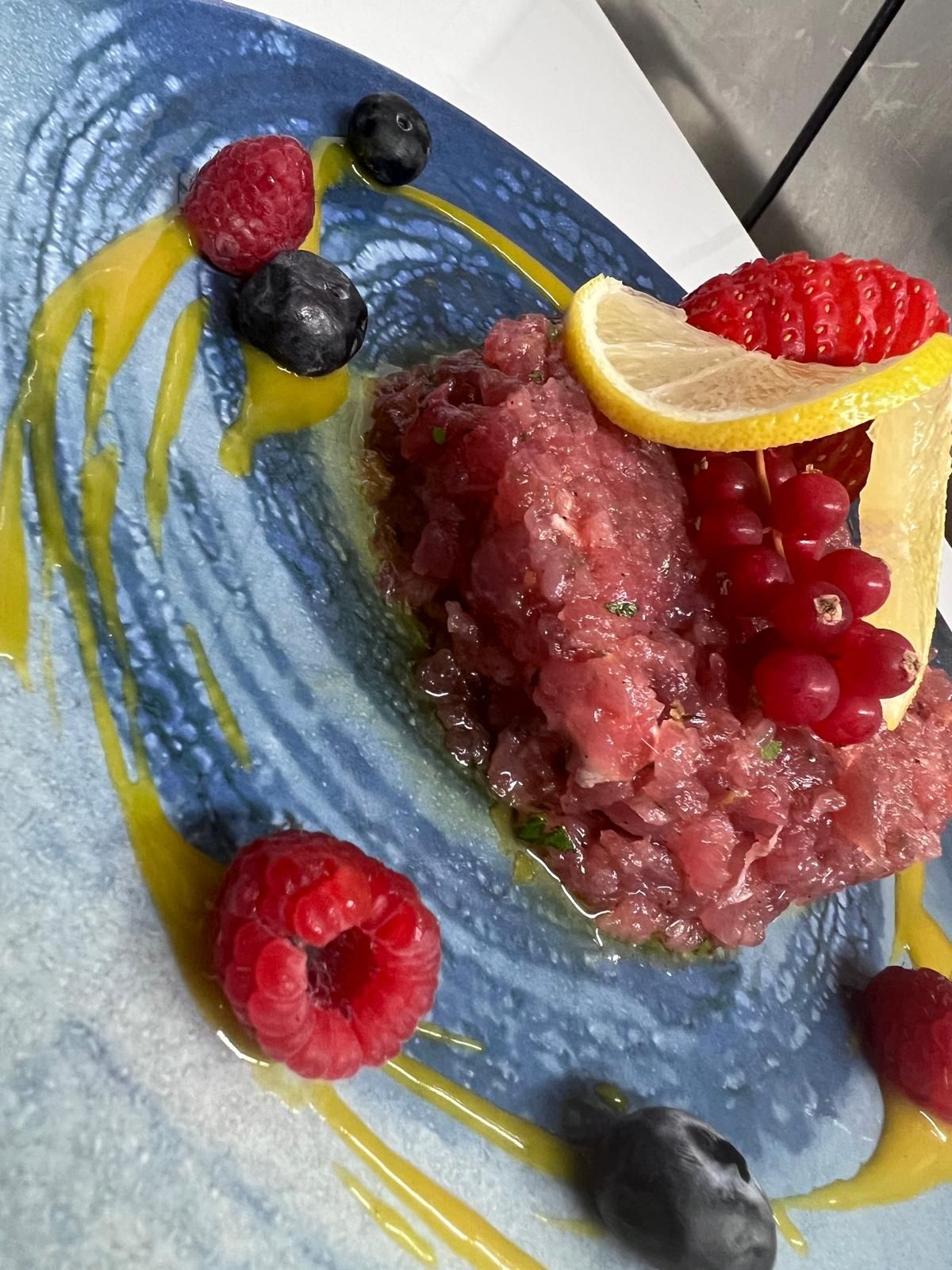 Non mancano opzioni di carne tra cui come carpaccio bresaola, crudo e mozzarella, tagliatelle ai porcini, costata di vitello alla brace, il tutto accompagnato da un’eccellente carta dei vini.