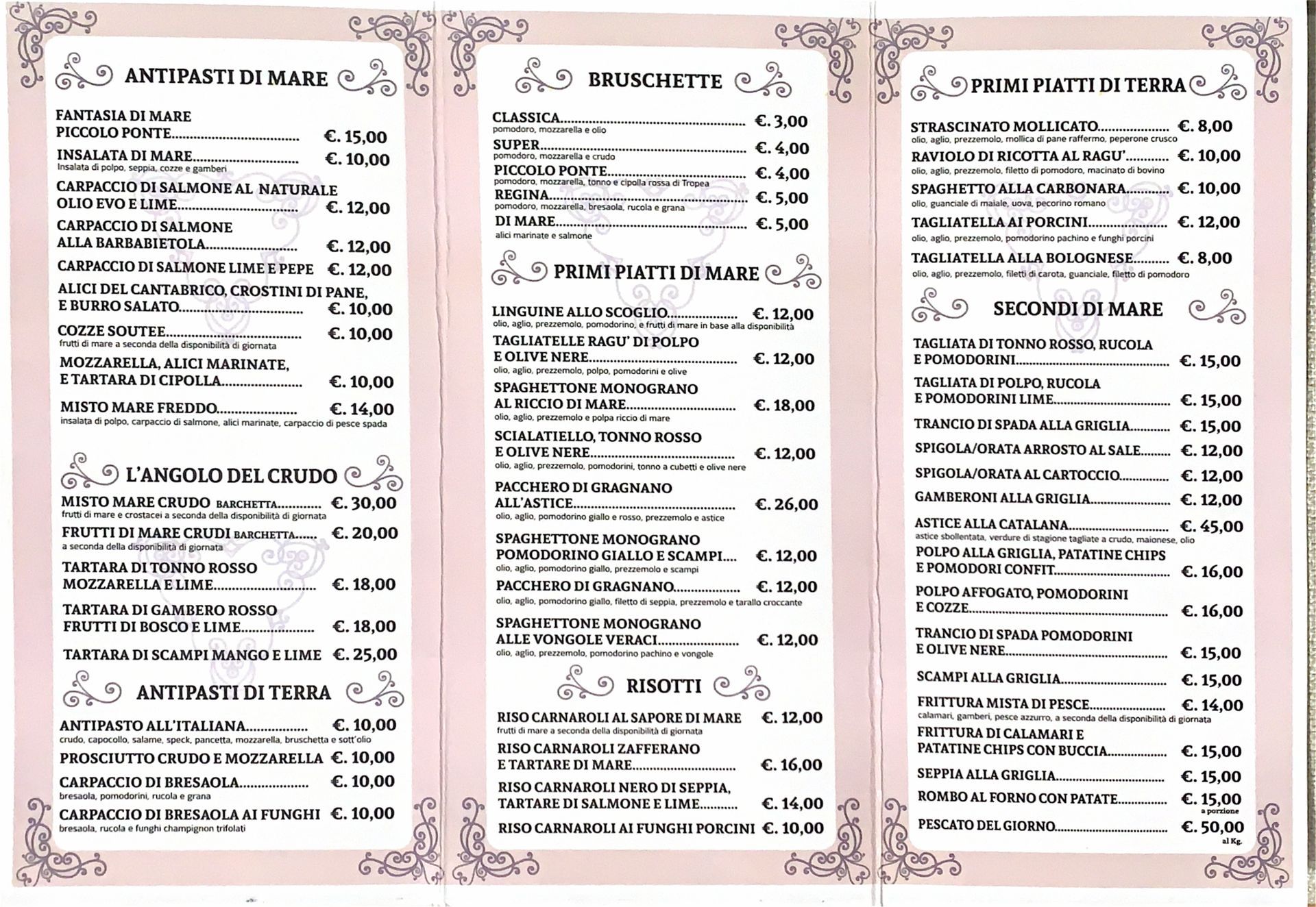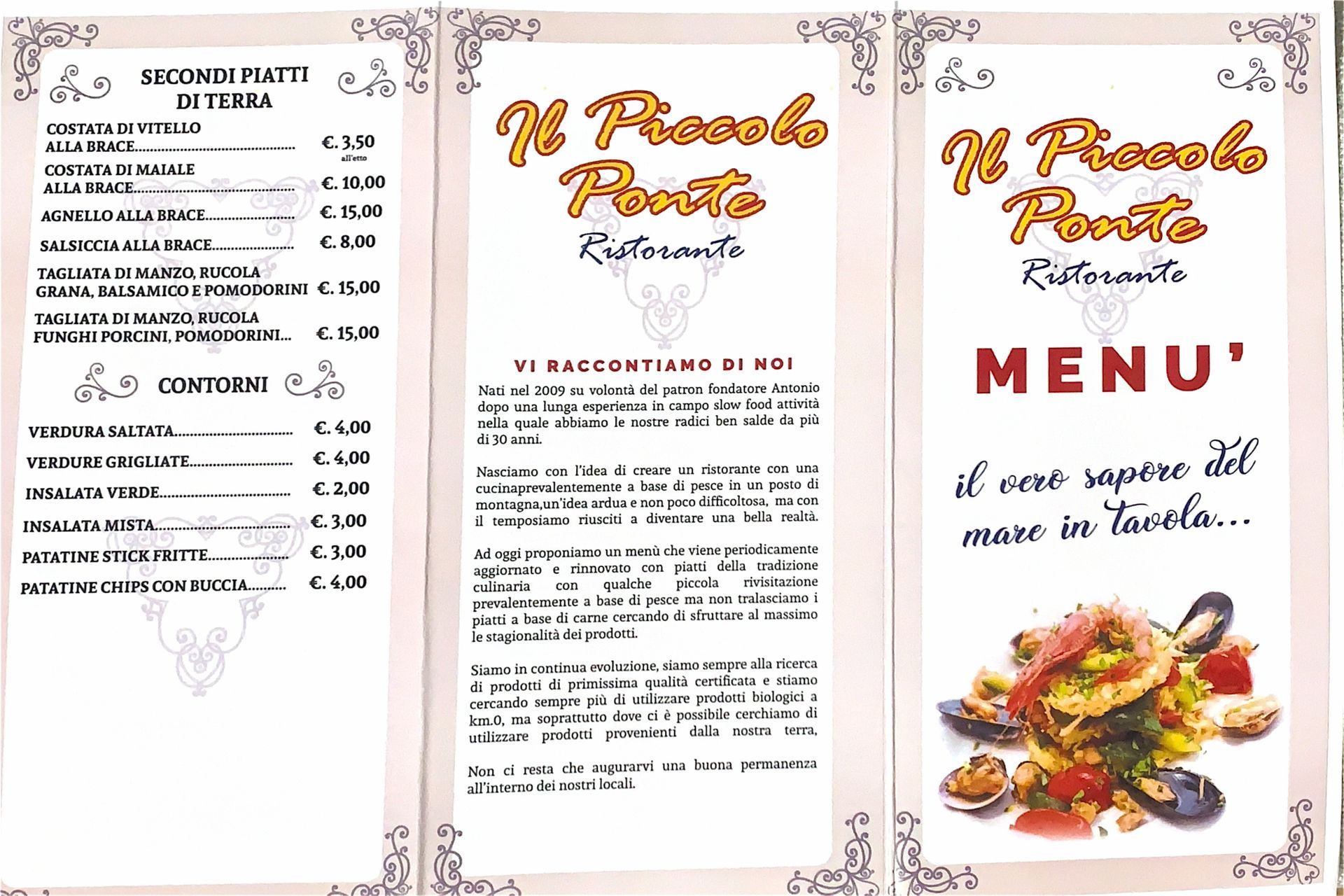 Il Ristorante Il Piccolo Ponte offre un’ampia selezione di piatti, con specialità di pesce e proposte di carne. Gli antipasti spaziano dal misto mare alle cruditè, passando per tartare e insalate di mare. Tra i primi, paccheri all'astice, linguine allo scoglio e risotti esaltano i sapori del mare. I secondi includono tagliata di tonno, frittura di pesce e trancio di spada.